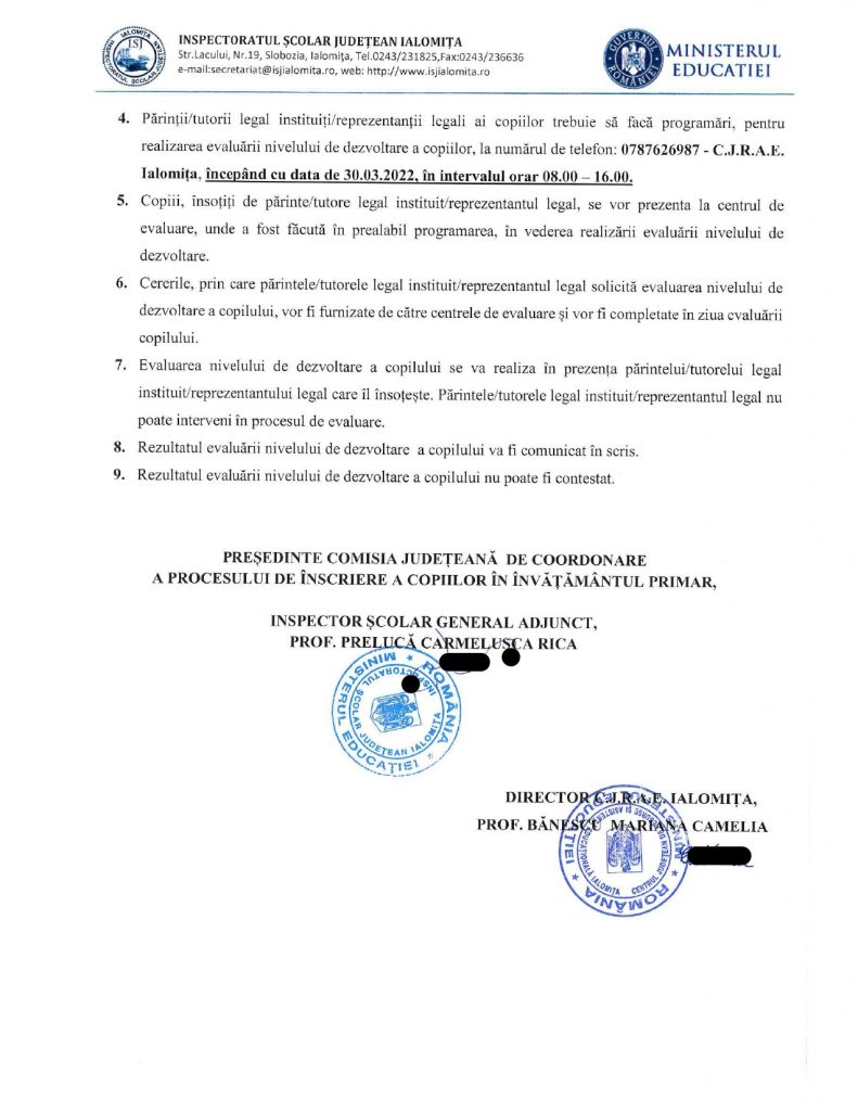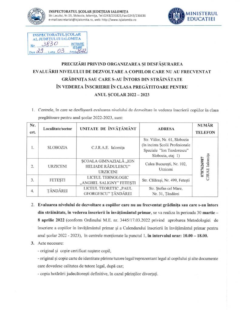 PRECIZĂRI PRIVIND ORGANIZAREA ȘI DESFĂȘURAREA EVALUĂRII NIVELULUI DE DEZVOLTARE A COPILOR CARE NU AU FRECVENTAT GRĂDINIȚA SAU CARE S-AU ÎNTORS DIN STRĂINATATE ÎN VEDEREA ÎNSCRIERII ÎN CLASA PREGĂTITOARE PENTRU ANUL ȘCOLAR 2022-2023