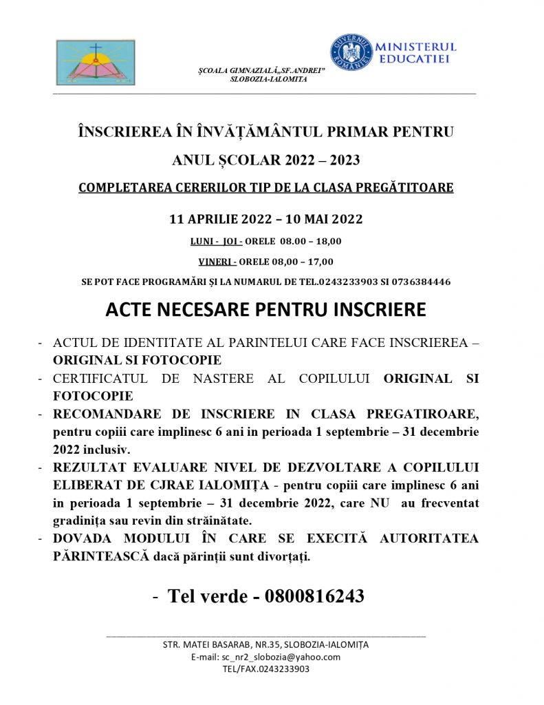 Completarea de către părinți/ tutori legal instituiți/ reprezentanți legali, online sau la unitatea de învățământ la care solicită înscrierea copiilor, a cererilor-tip de înscriere și validarea cererilor-tip de înscriere la unitatea de învățământ la care solicită înscrierea copiilor se va desfășura în perioada: 11 aprilie 2022 – 10 mai 2022, luni-joi 08-18, vineri 08-17